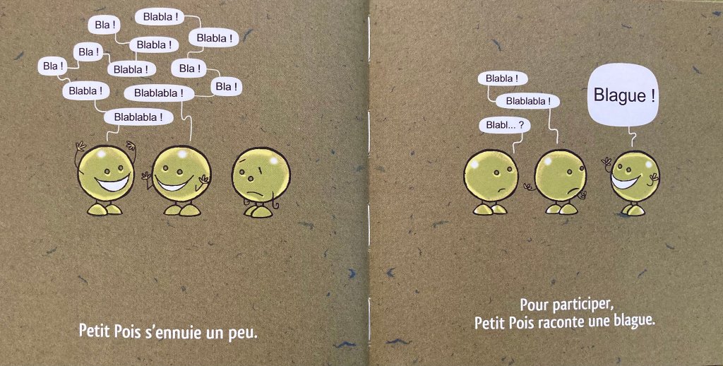 A hauteur d’enfant, simple mais jamais simpliste, on suit Petit Pois et Poire dans leur quête de l’amitié et de l’affirmation de soi. C’est extrêmement drôle, touchant et surtout très universel : on retrouve ici des scènes de cour de récré comme de la vie d’adulte. Identification (quasi!) garantie et également excellente base de discussion avec un enfant qui pourrait traverser les mêmes épreuves.