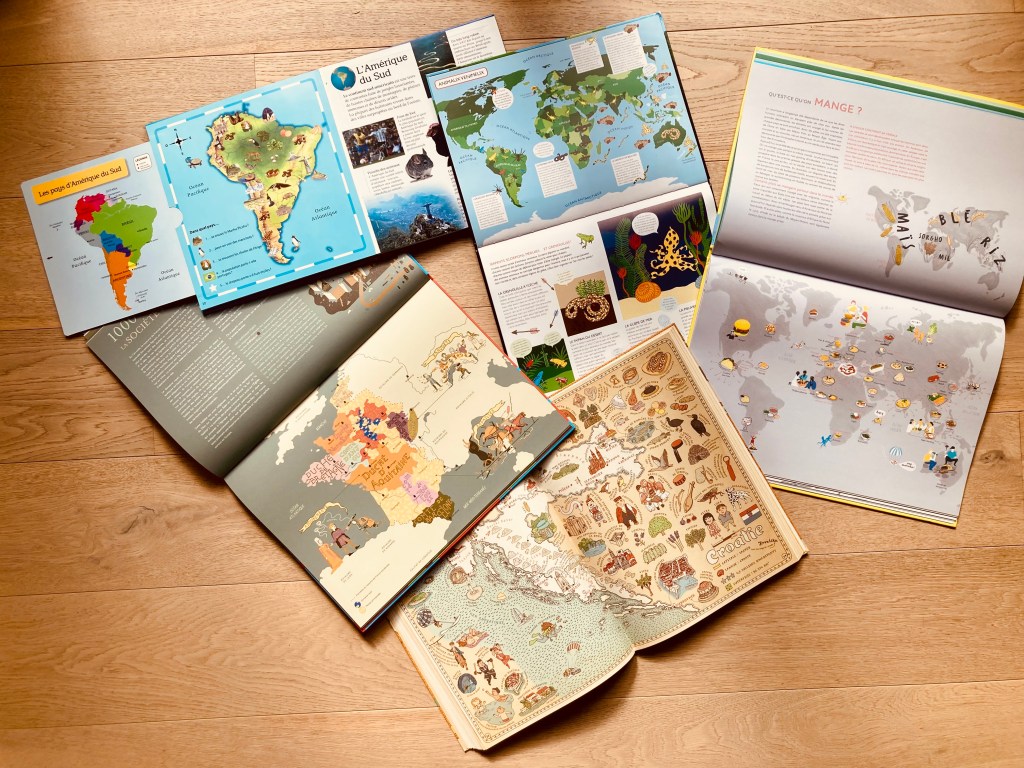 – Pour terminer le voyage en beauté, Cartes est un livre qui saura émerveiller les petits yeux avec sa compilation de cartes de 64 pays dessinées à la main, foisonnantes de détails. Outre les éléments de géographie physique, une foule d’illustrations plus culturelles ou scientifiques (monuments, spécialités culinaires, animaux et végétaux, éléments du folklore…) ornent ces magnifiques cartes, garantissant des heures d’observation et de rêverie. Un livre pour éveiller la curiosité et donner envie de découvrir le monde !