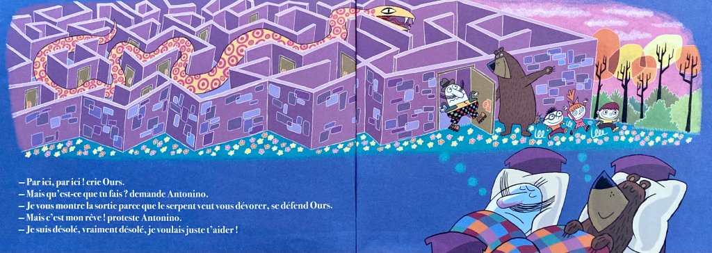 Antonino, son truc, c’est apparemment de sauver les personnes en détresse. Dans Antonino de rêve en rêve, il est donc fort contrarié quand Ours s’introduit continuellement dans ses rêves glorieux pour lui chiper innocemment sa place de sauveur. Mais dans un ultime songe, c’est bien Ours qui finira par le sauver d’une vilaine chute, lui rappelant combien il est précieux d’avoir quelqu’un sur qui compter et avec qui partager les bons comme les mauvais moments.