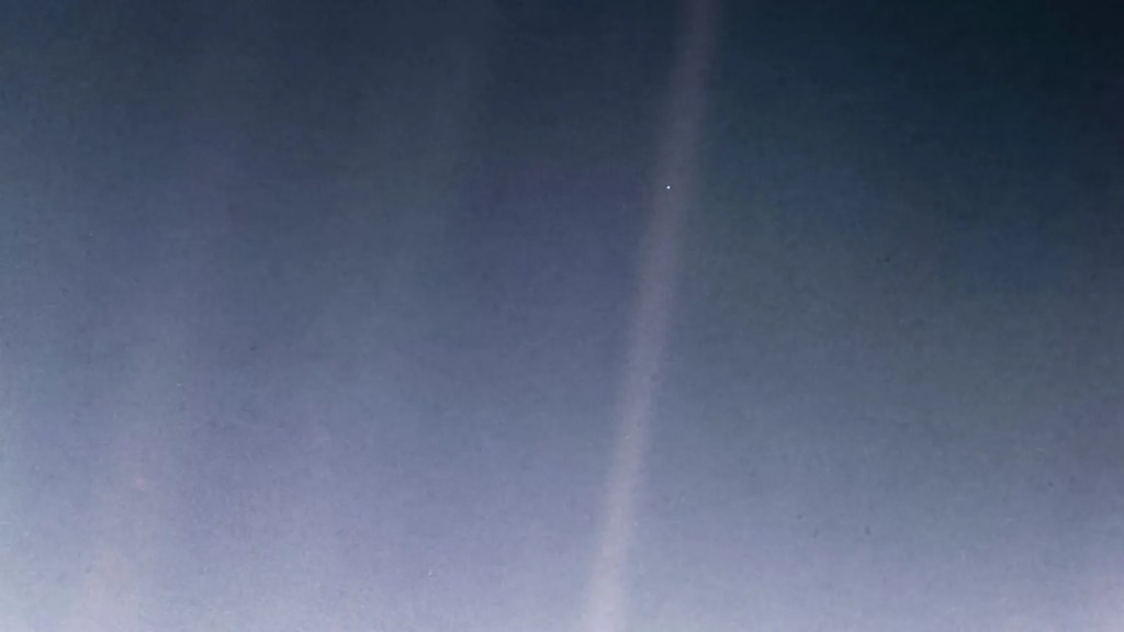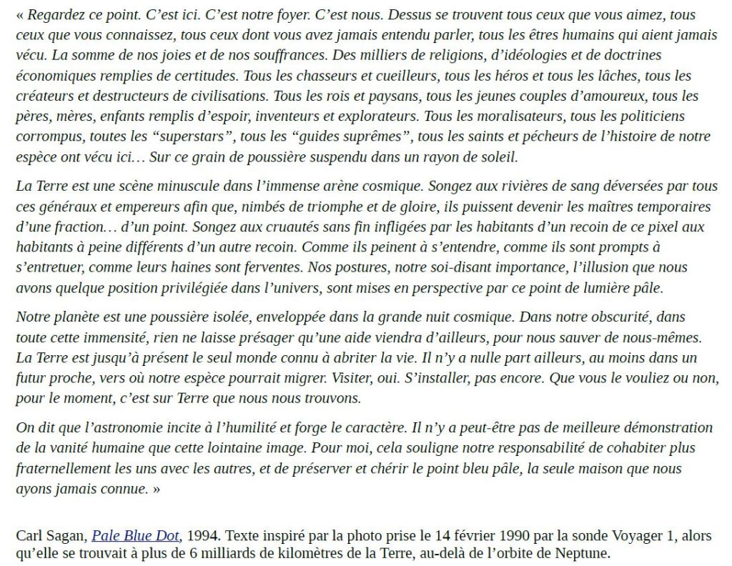Et pour clore cet article, je ne résiste pas à l’envie (au besoin ?) de partager le magnifique texte « Pale blue dot », écrit par l’astrophysicien Carl Sagan en 1994 et inspiré par l’image la plus lointaine que nous possédons de notre planète (prise par la sonde Voyager 1, qui dérive aujourd’hui on ne sait trop où dans l’univers avec une capsule temporelle à son bord).