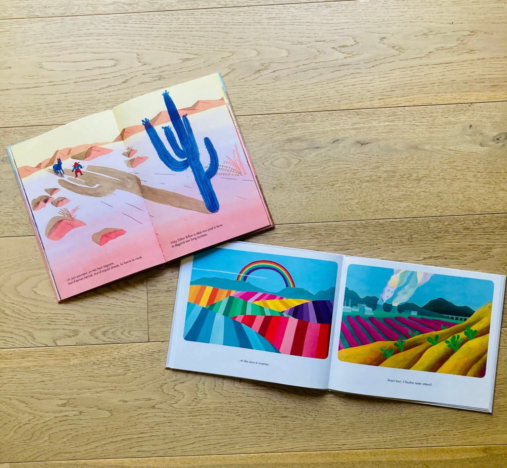 – C’est l’histoire d’un autre grand départ, mais bel et bien consommé/consumé celui-ci. Le jour où Vicky Dillon Billon n’a pas bu son bol de lait et fut grondée, elle s’est tirée, loin du ranch, loin de sa mère. Vicky est en colère, et elle parcourt le Far West avec sa bande de copines hors-la-loi en laissant éclater la rage qui l’anime. Dévaliser des banques, attaquer la diligence, faire du rodéo, s’évader du pénitencier : rien n’éteint le feu qui la dévore…Une excellente métaphore de la frustration et de la colère enfantine, traduite en mots et en images par Véronique Seydoux et Hélène Georges, dans un décor de désert aux couleurs de nurserie, où les saguaros parsèment les pages de leurs épines. Heureusement, sous les épines, ces cactus cachent aussi de fragiles fleurs qu’il faut savoir cueillir pour s’apaiser et retrouver son foyer… Un western libérateur et très bel album d’apprentissage !
