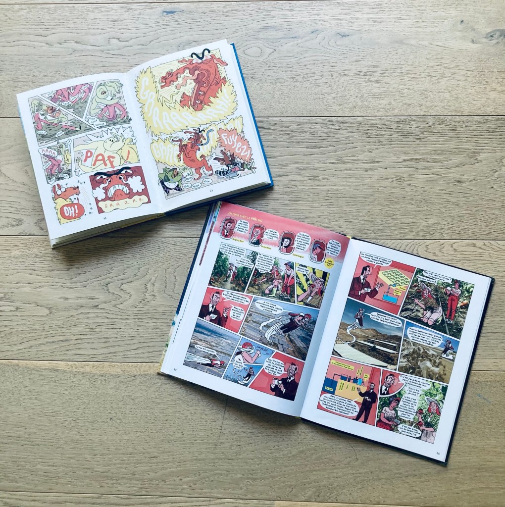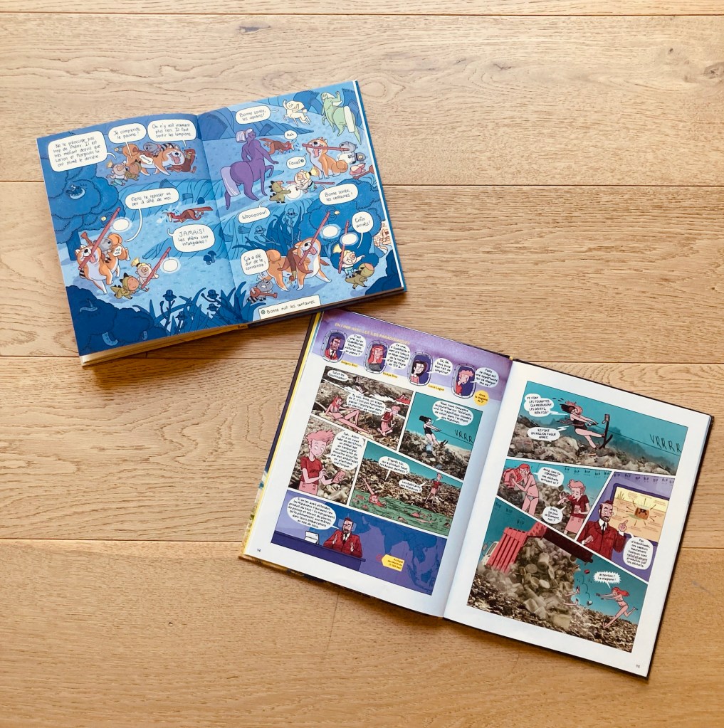 – On s’indigne, on s’arrache les cheveux face à ces Bourrinologues qui essentialisent le pire de notre humanité. Mais on se marre aussi… C’est là toute la force de cette excellente BD, initialement publiée dans le magazine GÉO Ado, qui met en scène Grégory Bour, Nickye Rino et Lucie Logue, trois anti-journalistes spécialistes de la destruction de la planète, cyniques et antipathiques au possible. Un voyage organisé par leurs soins à Nuisance Land, façon grande opération de comm’, pour donner à voir les entreprises les plus crasseuses en cours aux quatre coins du monde. Des Bourrinologues qui adorent user la planète comme les stagiaires de 3ème qui les accompagnent… Passionnante par les sujets (hyper bien documentés) abordés, hilarante et révoltante à la fois, Les bourrinologues est une grande réussite signée Lucie Castel, Nicole Augereau et Grégory Jarry. De la BD qui manie avec talent le 2ème degré (voire le 15ème), pour alerter et parler avec justesse des (vrais) degrés qu’on se crée et se prend en pleine face…